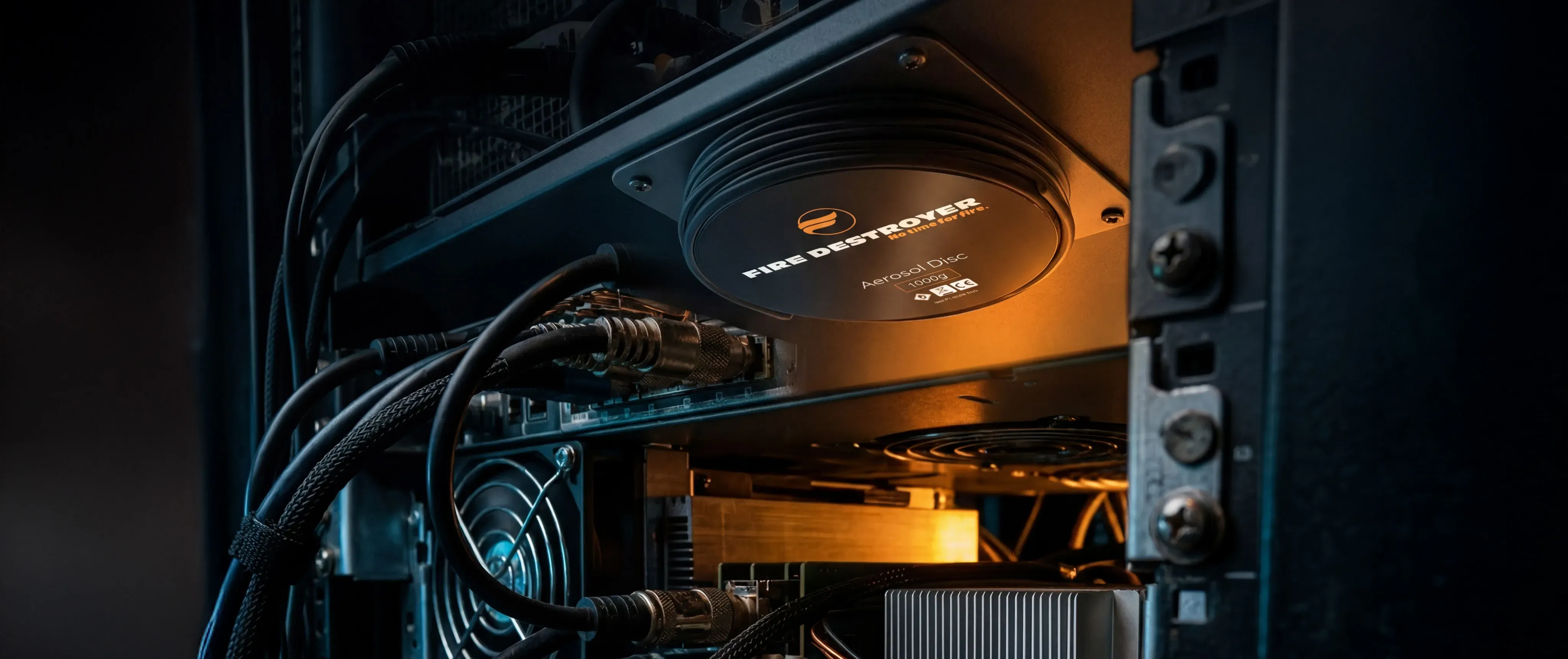 Ein ungiftiges Löschmittel, Aerosol oder Trockenpulver, verteilt sich schnell im geschlossenen Raum und unterdrückt das Feuer in den Klassen A, B, C und F, bevor erheblicher Schaden entsteht.
